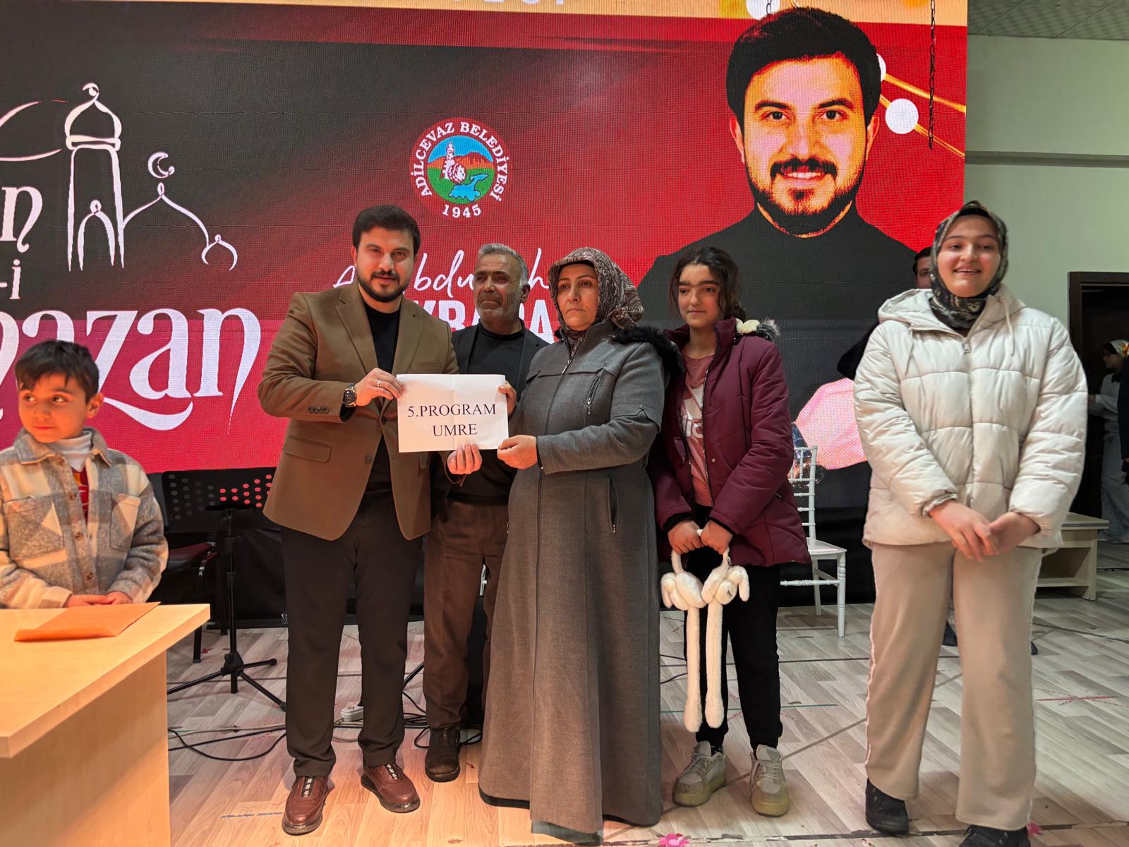 Adilcevaz Sosyal Hizmetler Kapalı Salonu’nda düzenlenen Ramazan etkinliğine ilçe halkı büyük ilgi gösterdi. İlahi dinletileri ve sürpriz hediyelerle şenlik havasında geçen gecede, yapılan çekilişler sonucunda talihli vatandaşlara umre ziyareti ve tablet hediye edildi.